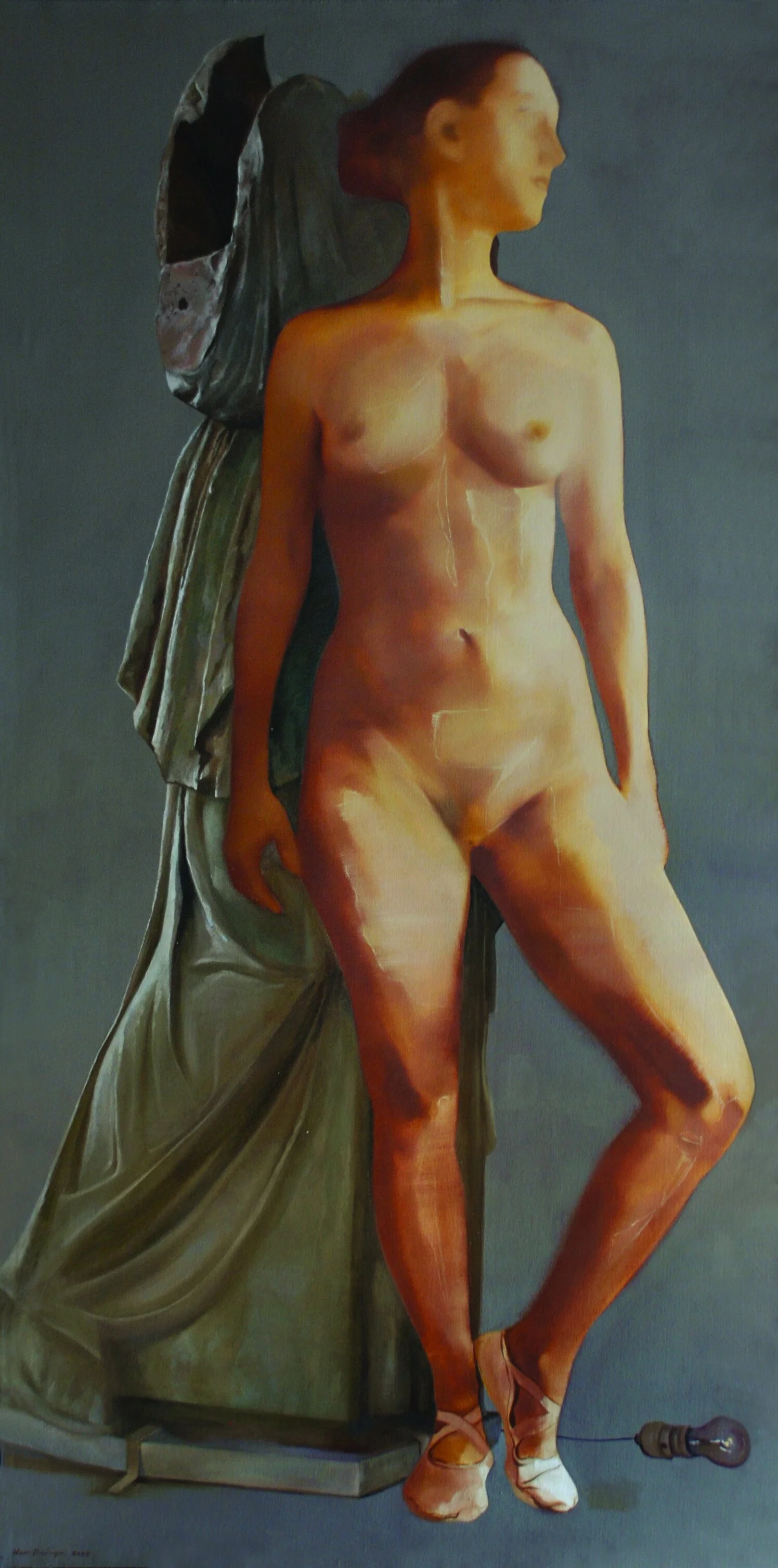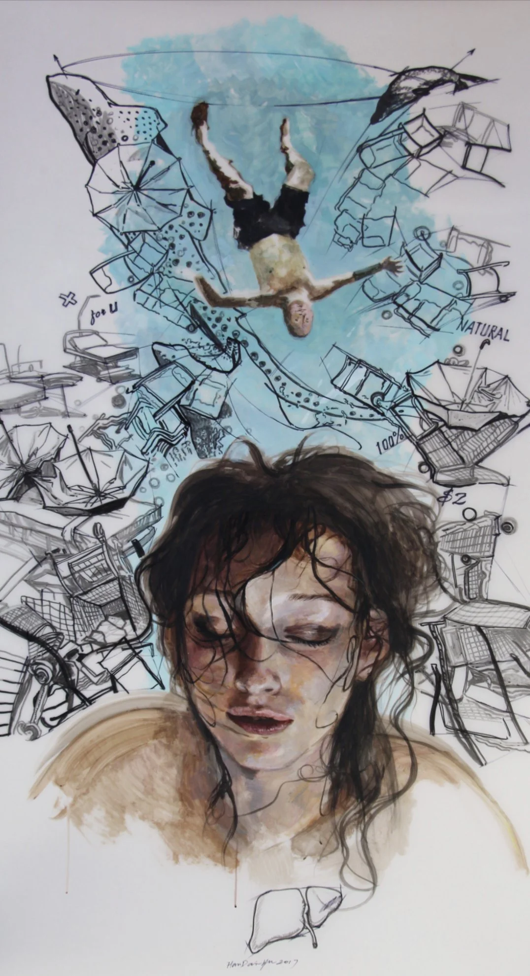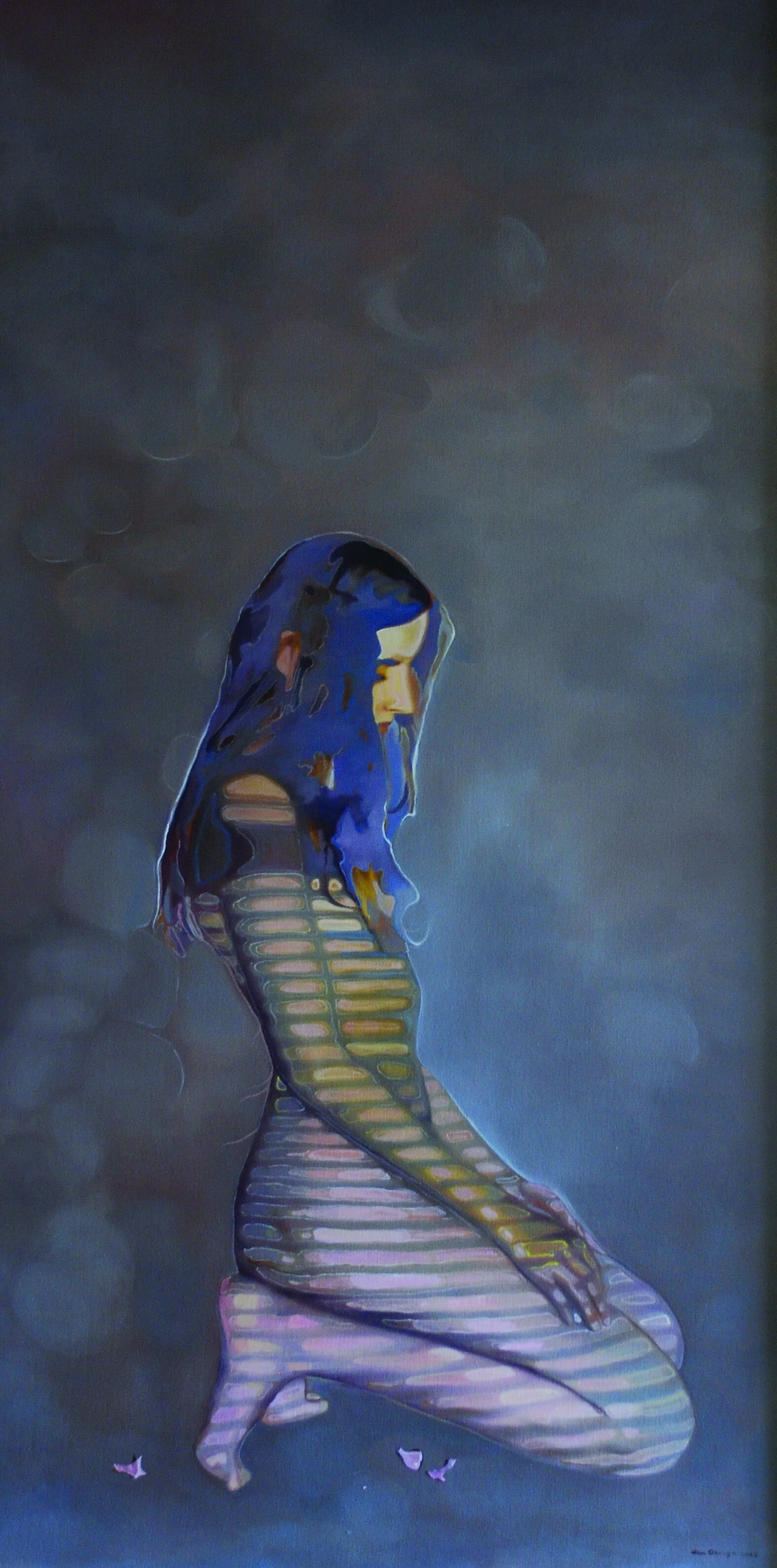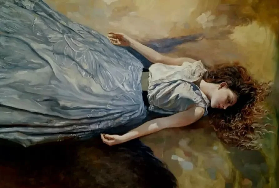 “By his own account, femininity serves as a significant source of inspiration for Han Dai-Yu. ‘The painting of the female body liberates me from my own [male] identity and gives me a higher level of freedom in my artistic expression. I believe that females are better able to represent the human being as a whole.’ In his hands, the female form is also capable of representing the sometimes difficult and vexing experiences of humans in transition, when we have ‘lost touch with the soil’ in search of the new – when are neither here nor there, in-between homes, jobs, lovers, identities, and creative preoccupations, when something old has been completed, but the future has not yet begun. Fantasy blends with reality to reflect the deeper levels of human experience in paintings that are as enigmatic as they are mesmerizing. ‘My art highlights the differences between realism and idealism,’ Dai-Yu notes. ‘This entire project is about creating beauty, or at least something that I consider as such.’ With his paintings of floating women, etherized as they are against the void, he certainly succeeds.”