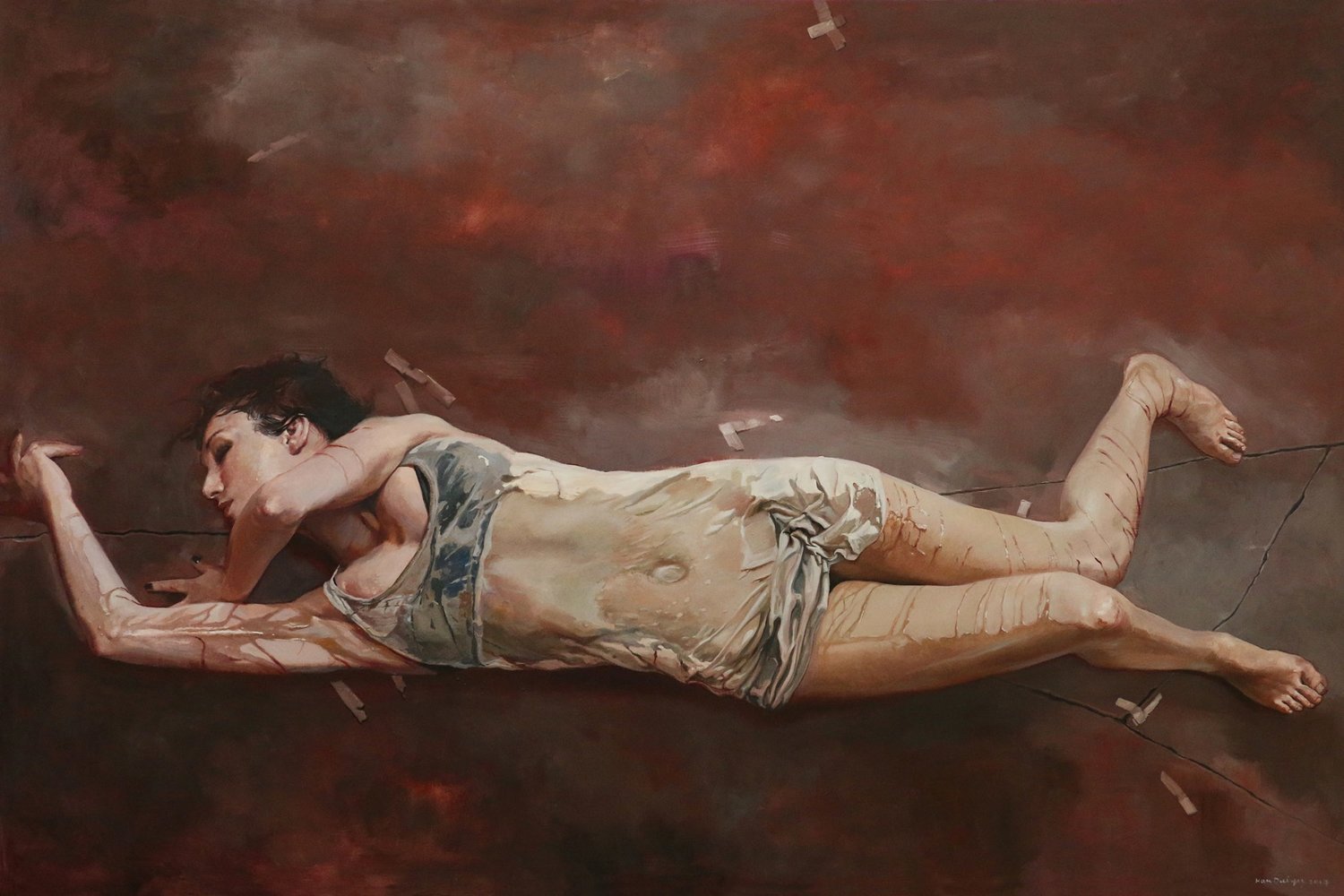 “Dai-Yu is working on a project that takes his representations of the female figure in a new, if equally universal direction. Entitled Defiled Beauty, it is a series of large-scale works that addresses our increasingly degraded environment and its detrimental effects on global humanity – a striking visual counterpoint to the earlier quiet and contemplative paintings. Inspired by the 2010 BP oil spill, that spewed over five million barrels of crude oil into the Gulf of Mexico, Dai-Yu depicts female figures covered in dirt and oil. ‘The works express my concern for current condition,’ he explains. ‘Our ambition, our greed, our misbehavior endangers our environment and alienates us from nature. Sometimes, people don’t understand the consequences of their actions until they are defiled, and yet they receive forgiveness, which only exacerbates the problem.’”