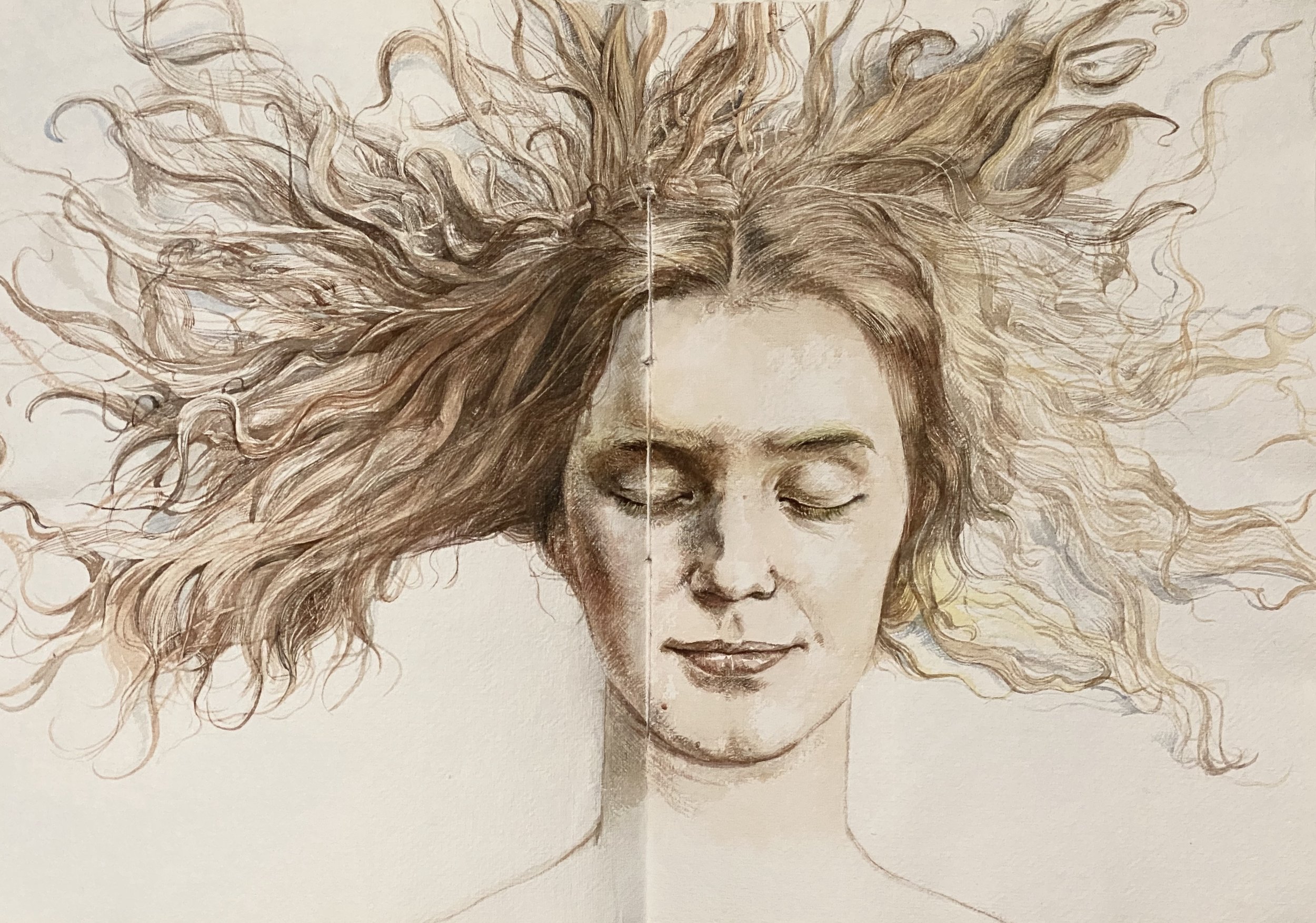 “Between 2006 and 2007, around the time that Dai-Yu settled into his new home in California, he created a series of watercolors and paintings that are interesting metaphors for his personal and creative journey. A master of the human figure, Dai-Yu focused his attention on a series of female heads, depicting them with eyes closed, their hair fanned out against non-descript backgrounds like flames swept by a sudden breeze. The women are sleeping perhaps, seen dead-on against their cream-colored sheets, yet their relaxed expression and gentle Buddha-smile suggests that they are meditating. Minutely rendered, with little detail left to the imagination, they nevertheless appear strangely disembodied, drifting before our eyes in a simultaneously display of heightened sensitivity and physical equilibrium.”
