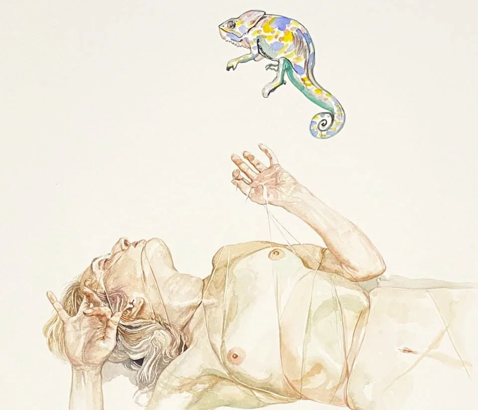collage-based figurative artworks on Mylar, combining traditional artistic methods with more contemporary mediums.